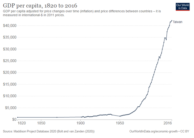 Ну вот давайте сравним как развивались материковый Китай, и сбежавшие от них на остров Тайвань китайцы. Я напомню, что Тайвань обрел независимость в 1950 году после победы в гражданской войне с коммунистическим режимом.